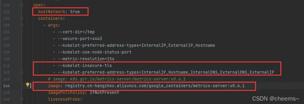 # 从一个能访问外网的地方下载一个yaml文件 https://github.com/kubernetes-sigs/metrics-server/releases/latest/download/high-availability.yaml # 修改yaml的参数 # 找到这个 -> image: k8s.gcr.io/metrics-server/metrics-server:v0.6.1 # 替换为 -> image: registry.cn-hangzhou.aliyuncs.com/google_containers/metrics-server:v0.6.1 # 再增加几个参数 hostNetwork: true args: - --kubelet-insecure-tls - --kubelet-preferred-address-types=InternalIP,Hostname,InternalDNS,ExternalDNS,ExternalIP # 如图