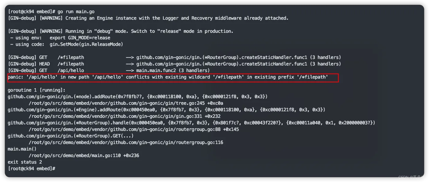 其实在gin处理时,已经匹配了/*filepath,因此,当我们还有其他路由需要处理时,就无法工作了,也就出现了路由冲突。