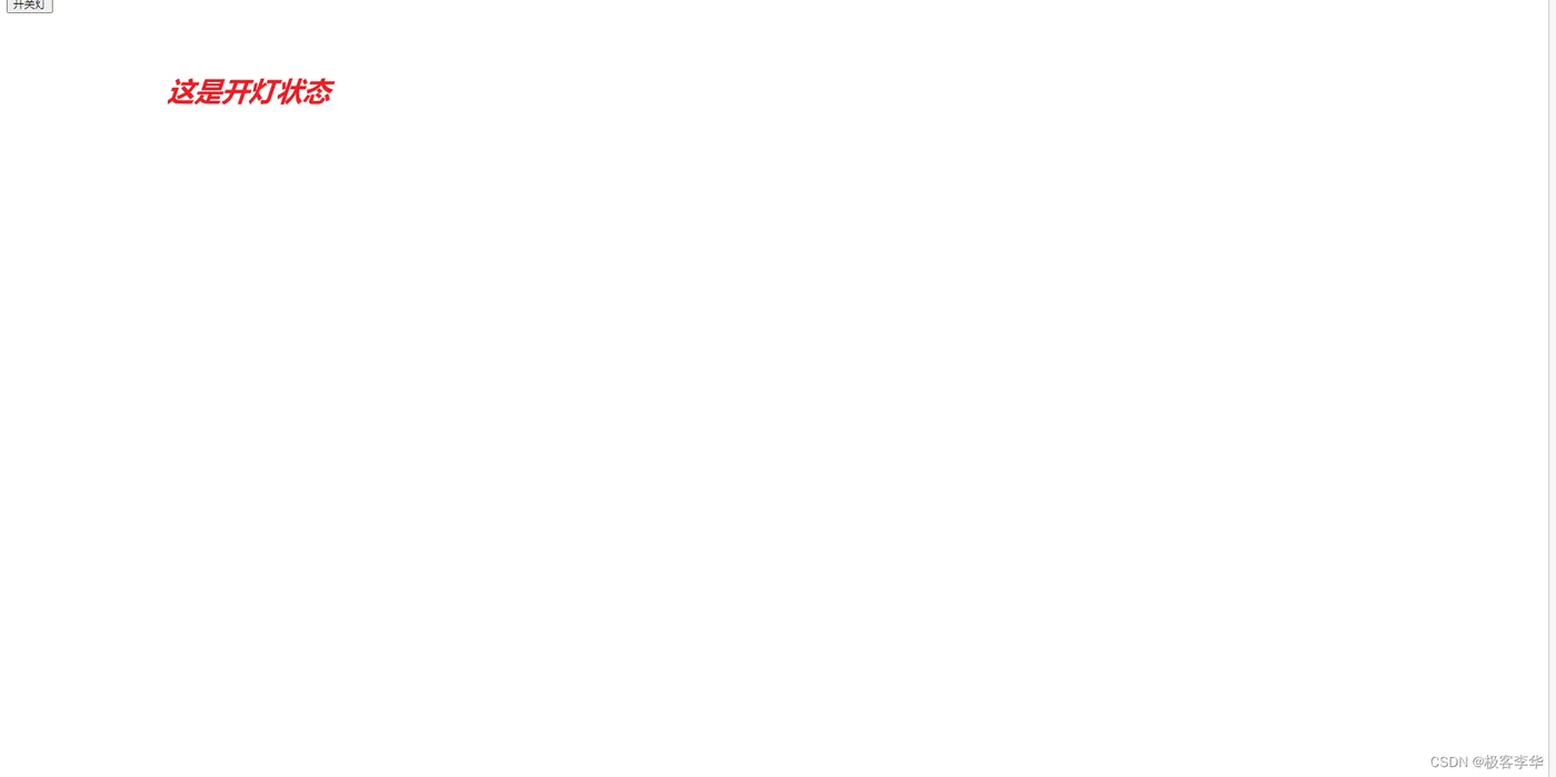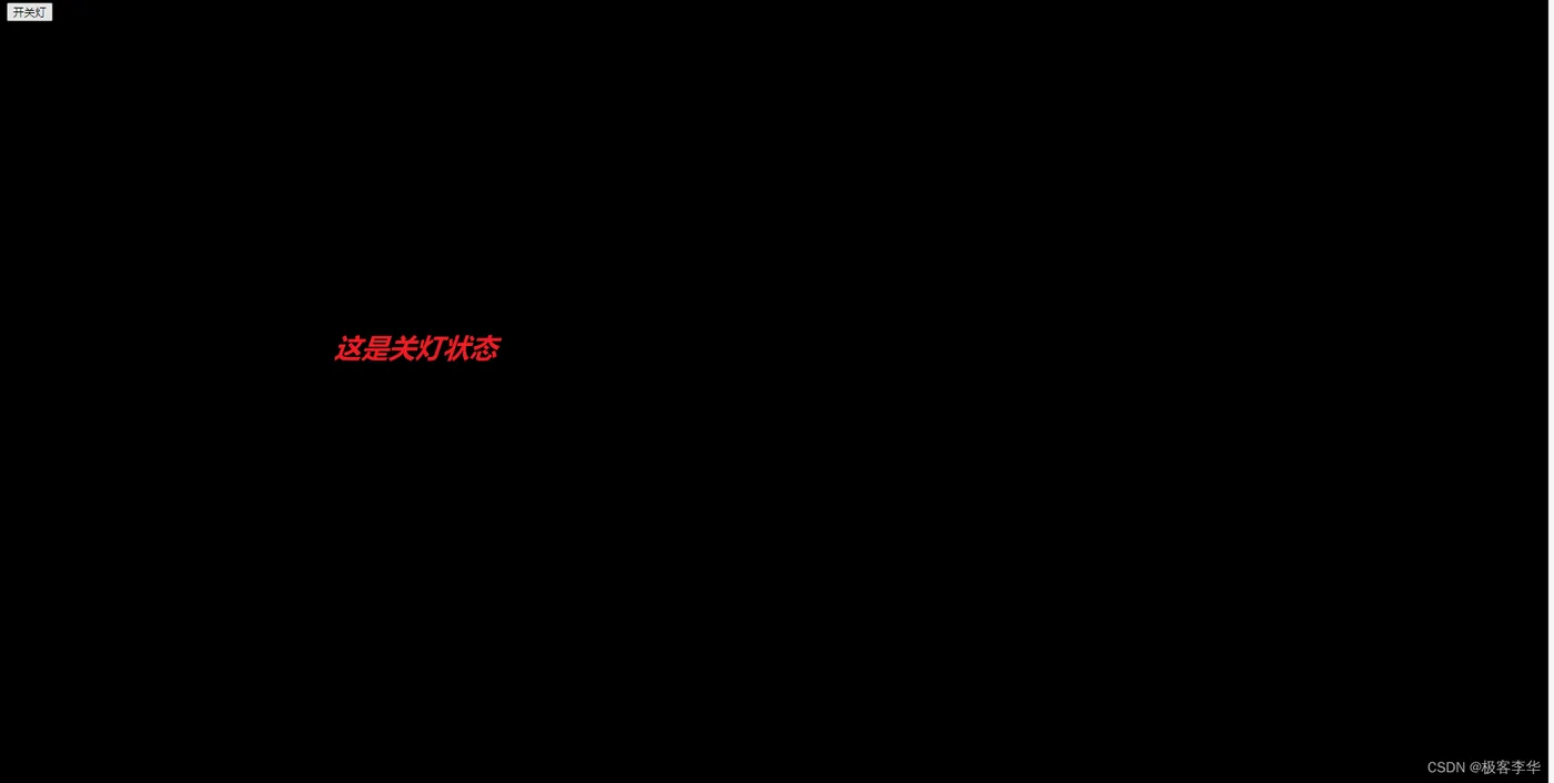 <!DOCTYPE html> <html lang="en"> <head> <meta charset="UTF-8"> <meta name="viewport" content="width=device-width, initial-scale=1.0"> <meta http-equiv="X-UA-Compatible" content="ie=edge"> <title>Document</title> <style> /* 制作一个设置背景为黑色的类 */ .bg { background-color: black; } </style> </head> <body> <div class=""></div> <button> 开关灯</button> <script> // classList 是一个类列表 存放的是一个标签拥有的类的个数 var div = document.querySelector('div'); var btn = document.querySelector('button'); btn.addEventListener('click', function() { // toggle意思为如果没有里面的那个参数 // 那么加入这个参数 // 反正去掉这个参数 // 这样可以简单的实现开关灯的效果 document.body.classList.toggle('bg'); }) </script> </body> </html>