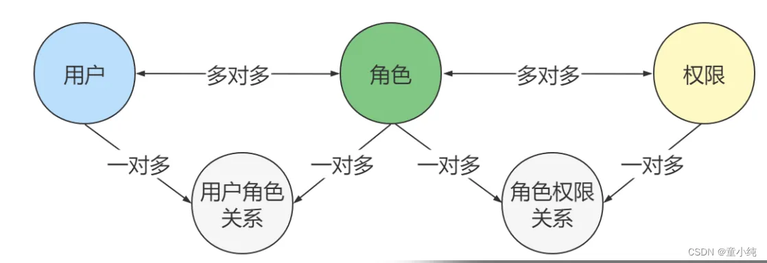 授权即认证通过后,系统给用户赋予一定的权限,用户只能根据权 限访问系统中的某些资源。所以在数据库中,用户需要和权限关 联。除了用户表和权限表,还需要创建角色表,他们之间的关系如下: