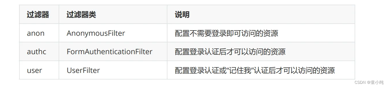 在以上案例中,虽然有认证功能,但即使没有登录也可以访问系统 资源。如果要配置认证后才能访问资源,就需要使用过滤器拦截请 求。Shiro内置了很多过滤器: