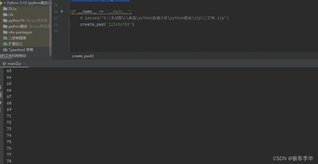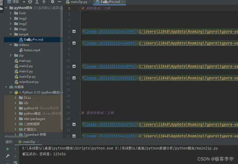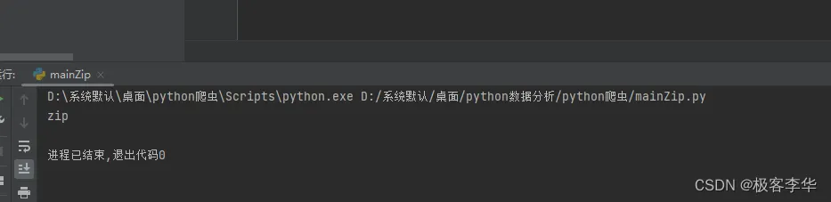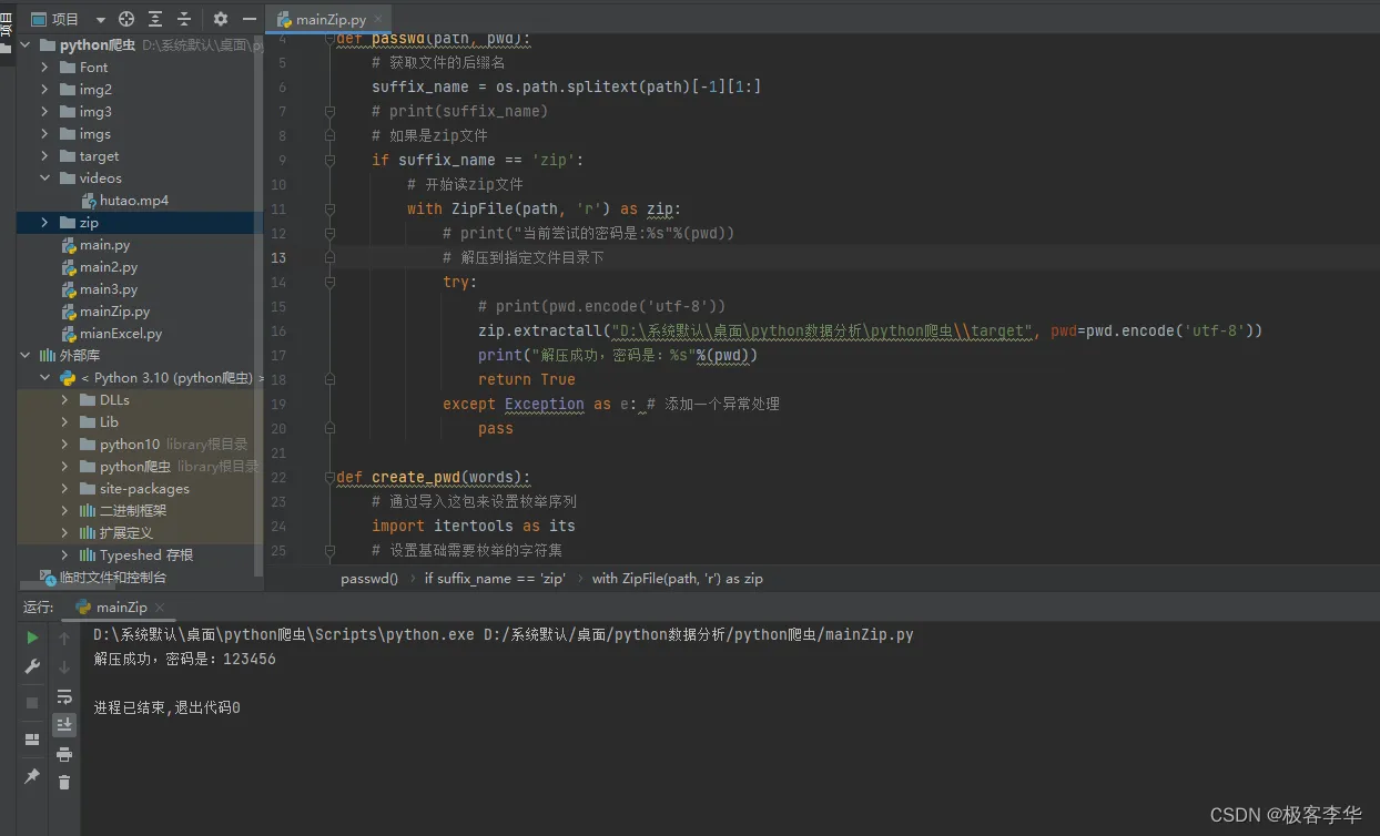 from zipfile import ZipFile import os def passwd(path): # 获取文件的后缀名 suffix_name = os.path.splitext(path)[-1][1:] # print(suffix_name) # 如果是zip文件 if suffix_name == 'zip': # 开始读zip文件 with ZipFile(path, 'r') as zip: # 解压到指定文件目录下 zip.extractall("D:\系统默认\桌面\python数据分析\python爬虫\\target") if __name__ == '__main__': passwd("D:\系统默认\桌面\python数据分析\python爬虫\zip\二叉树.zip")
