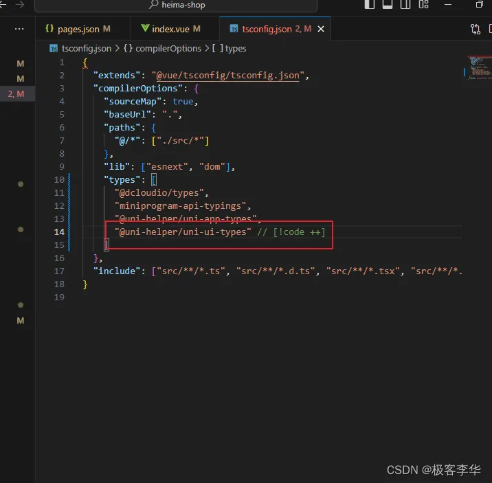 // tsconfig.json { "compilerOptions": { "types": [ "@dcloudio/types", "@uni-helper/uni-app-types", // [!code ++] "@uni-helper/uni-ui-types" // [!code ++] ] }