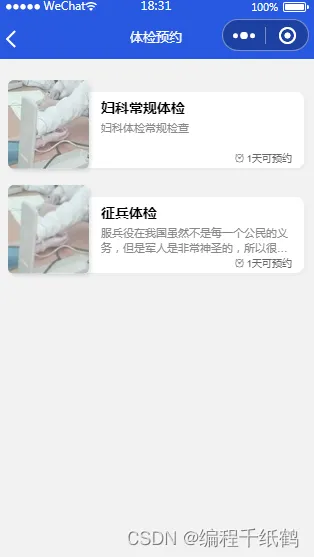 小程序健康管理系统前台用户登陆系统后,可以在首页点击进入体检预约模块进行在线预约。进入列表显示当前可以预约的体检套餐。相关体检展示操作界面如下图4-4所示。
