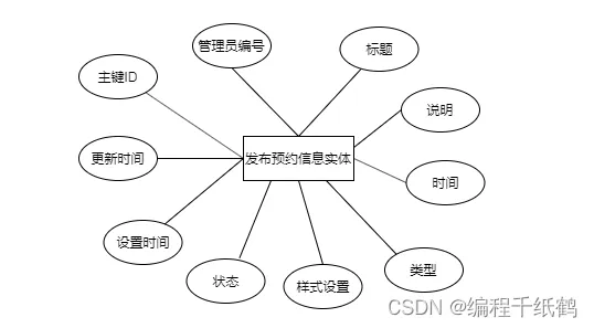 6、发布预约体检信息实体:主要存储管理员发布的预约体检的设置信息,主要包含管理员编号,预约样式设置,分类编号,状态等信息。