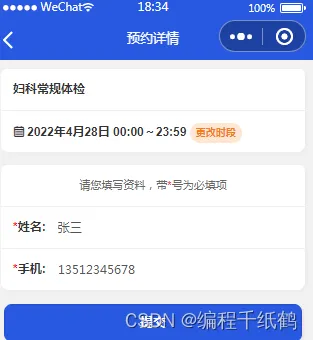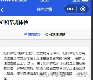 小程序健康管理前台用户在预约体检的列表中选择要预约的体检套餐后进入预约界面,可以查看预约须知,然后进入预约时间选择时间段进行预约。在线预约如下图4-5、4-6、4-7所示。
