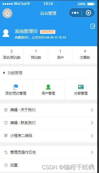 5、信息统计管理:主要统计并查看预约数、用户数、文章数等相关信息。