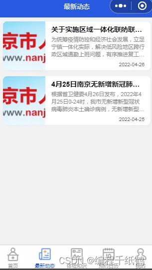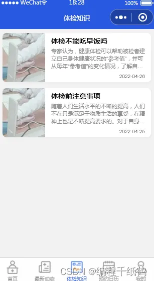 小程序健康管理系统前台用户登陆系统后可以点击首页或下面的体检知识菜单进入体检知识文章列表页面。具体展示界面如下图4-3所示。