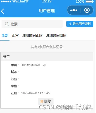 1、用户管理:可以管理前端注册的小程序用户信息,进行相应的数据查看和导出操作。