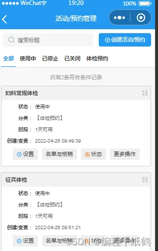 3、预约管理:可以发布新的预约信息,并可以对己发布的预约信息进行修改和状态的设置,同时可以查看前端小程序用户的预约信息,并可以进行预约核销操作。