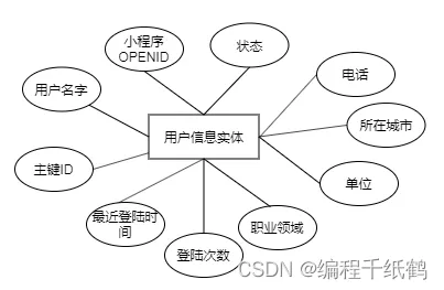 2、用户信息实体:主要存储前端注册的用户信息,前端小程序用户使用微信注册登陆后可以在系统中修改个人的基本信息,主要包含姓名、电话、城市等信息。
