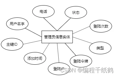 1、管理员信息实体:主要分析得出小程序后台管理员的信息实体属性,主要有主键,名字,电话等相关信息组成,具体结构如下图所示: