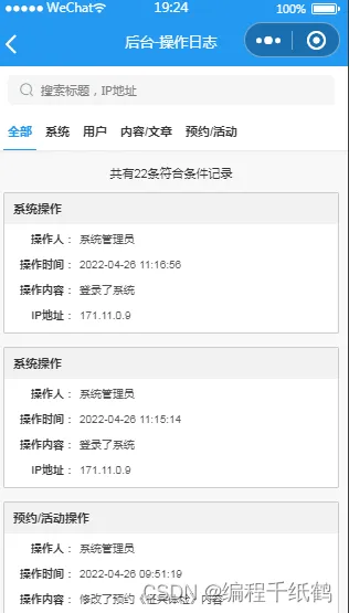 小程序健康管理员用户登陆系统后,在后台可以分类查看用户的系统操作日志。日志操作管理界面如下图4-16所示。