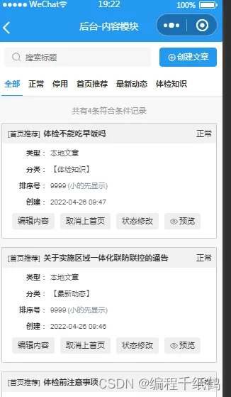 2、内容管理:在内容管理查获块,主要进行动态新闻和体检知识的发布、编辑、修改状态、预览和上首页的操作,上首页的功能类似于置顶操作。