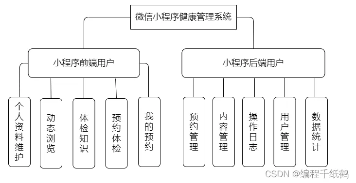 经过对微信小程序健康管理系统的需求分析,总结出了系统各类用户角色需要的功能模块,进行了基本的功能模块设计,具体的各角色相关的功能模块如下图3-1所示。