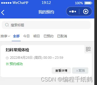 点击我的预约可以查看个人预约的体检信息,可以查看详情以及取消预约操作,具体展示如下图4-10所示:
