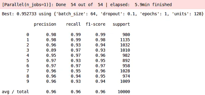 我们正在探索超参数网格中的每个参数,并打印出一个分数。 网格搜索就是这样搜索最佳可用模型的。 当我们都完成后,将选择一个模型。 在这种情况下,这是隐藏单元数量最多的一个,我们将评估该模型在分类报告中使用测试数据的效果。