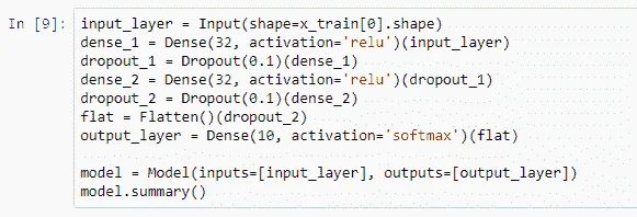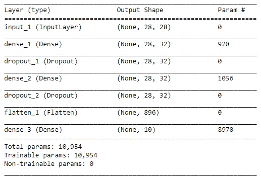 我们从一个输入层开始,该输入层的形状与我们的一个输入样本相同。 在我们的案例中,我们选择了一张训练图像,从上一课中我们知道它的大小为28x28像素。 现在,我们将其传递给栈。 紧随其后的是dropout_1,紧接着是dropout_2,然后我们最终变成softmax激活,将其切换到输出层。 然后,我们将这些作为输入和输出组合到模型中。 然后,我们打印summary,如下所示: