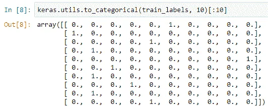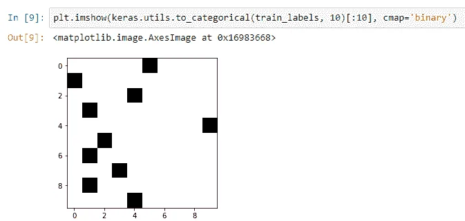 因此,为此,我们将使用数据转换技巧。 这种事情称为“单热编码”,在这里您可以获取一系列标签可能性,在这种情况下,将数字0至9转换为一种位图,其中每个选项都编码为一列,并且对于每个给定的数据样本,只有一列设置为1(因此为一热):