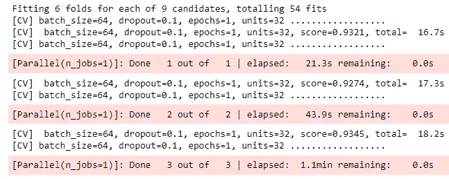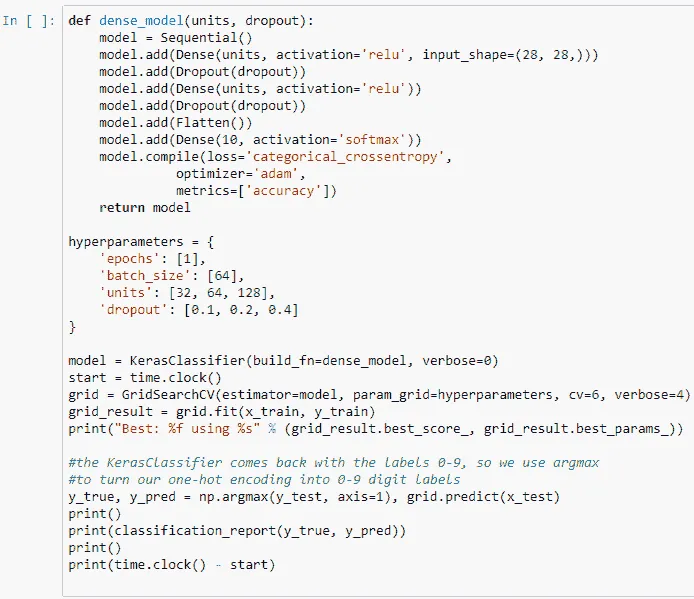现在,我们设置KerasClassifier,将其交给我们刚刚创建的模型构建函数,并将verbose设置为0以隐藏每次 Keras 运行的进度条。 然后,我们设置一个计时器; 我想知道这需要多长时间。 现在,我们设置了带有交叉验证的网格搜索。 对于其估计量,我们给我们提供我们的模型,即我们的KerasClassifier包装器和我们的grid参数(请参阅前面的超参数),然后说cv=6,这意味着将数据(训练数据)分为六个不同部分,然后交叉验证。 在5上进行训练,并使用六分之一进行验证并反复重复此步骤,以搜索最佳的超参数值。 另外,将verbose设置为4,这样我们就可以看到很多输出。 现在仅 Keras 就运行了很多东西,我们将fit函数从我们的x训练数据(同样是我们的输入图像)转到我们的y训练数据(这些是从零到数字的标签) 九),然后打印出我们最好的结果。 请注意,我们实际上尚未触及我们的测试数据。 我们将在稍后使用它来对网格搜索报告的最佳模型的值进行评分。
