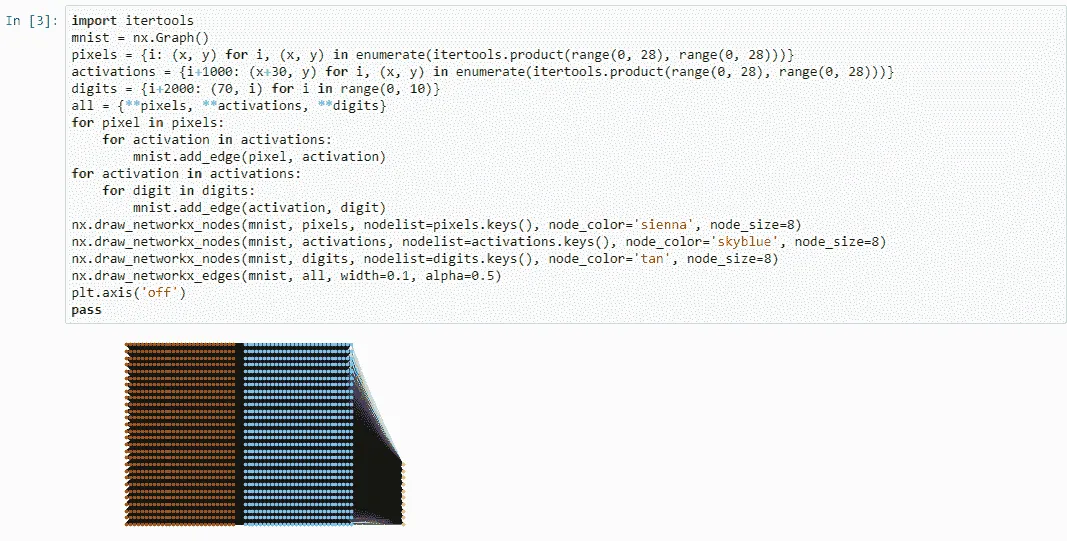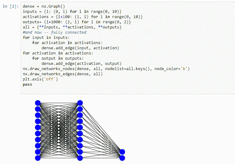 这就是中间的这两个循环。 他们在每个输入和每个激活之间,然后在每个激活和每个输出之间都处于优势地位。 这就是定义密集神经网络的原因:所有输入和所有激活之间以及所有激活和所有输出之间的完全连接。 如您所见,它生成的图片连接紧密,因此得名!
