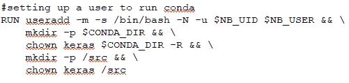 当我们运行笔记本时,它们将以该用户身份运行,因此您将始终知道谁拥有文件。 并非一定要创建特定用户来设置容器,但是可以确保设置一致,这很方便。 随着将这些技术更多地与 Docker 结合使用,您可能会探索不同的基础镜像,并且在这些镜像上设置的那些用户目录可能与您期望的不完全相同。 例如,您可能使用其他外壳程序或具有其他主目录路径。 自行设置可保持一致。