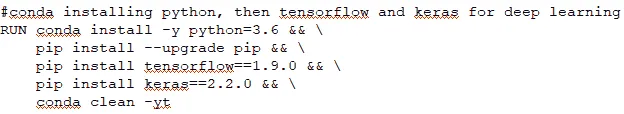 这将是我们在这里使用的 Python,并且我们将在其之上安装 TensorFlow 和 Keras,以拥有一个完整的环境。 您会在这里注意到我们同时使用conda和pip。 因此,conda是 Anaconda Python 随附的包管理器,但是您也可以使用常规的pip命令添加无法作为conda预打包图像使用的包。 因此,您可以始终以这种方式混合搭配以获取所需的包装。