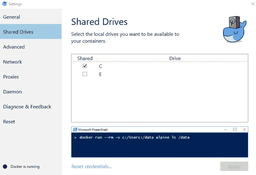 现在,这将弹出一个新窗口,要求您输入密码,以便我们允许 Docker 将共享驱动器映射回我们的 PC,以便可以从容器内看到我们 PC 的硬盘。 该共享位置是我们将要工作和编辑文件的位置,以便我们可以保存我们的工作。