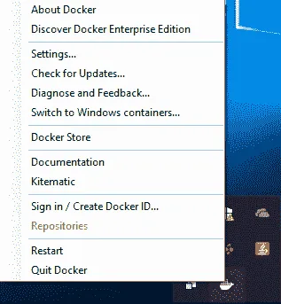 现在,假设您已经安装并运行了 Docker,则需要从“设置…”菜单中的可爱小鲸鱼进入 Docker 设置。 因此,转到任务栏的右下角,右键单击鲸鱼,然后选择“设置…”: