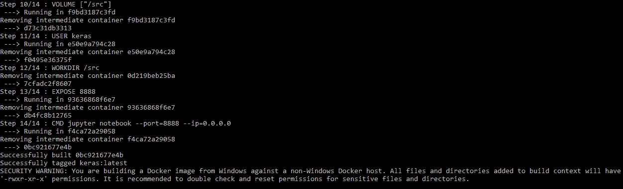 现在,我们实际上将使用docker build命令来构建容器。 我们将使用-t为其命名为keras,然后继续运行以下命令: