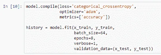 在以下屏幕截图中,我们正在使用loss,optimizer和metrics编译模型: