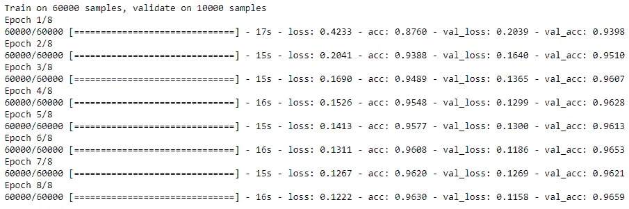 现在,我们准备用x训练数据(由实际的 MNIST 数字图像组成)和y训练参数(由零至九个分类输出标签组成)拟合模型。 我们这里有一个新概念是batch_size。 这是每个执行循环的图像数。 通常,这受可用内存的限制,但是较小的批量大小(32 到 64)通常会更好。 那么这个奇怪的词呢? 周期只是指循环数。 例如,当我们说八个周期时,我们的意思是机器学习模型将遍历训练数据八次,并将使用测试数据来查看模型变得八次准确的程度。 当模型反复查看相同的数据时,它会提高准确率,如以下屏幕截图所示: