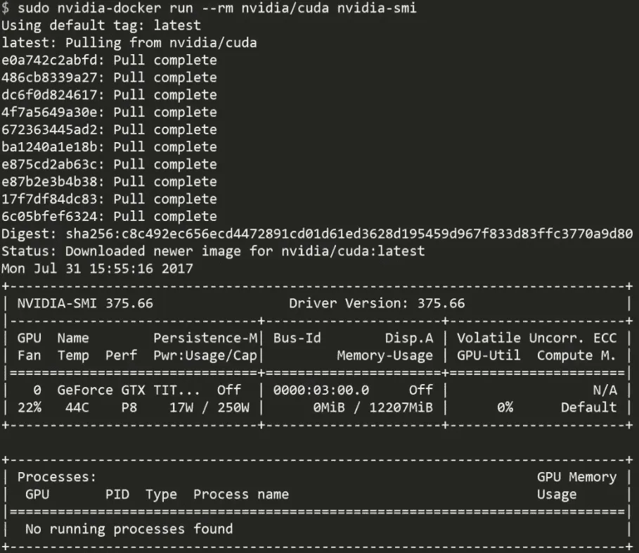 您会看到,我们的 TITAN X 完全暴露于 Docker。 安装 Docker 是一个相对容易的操作。