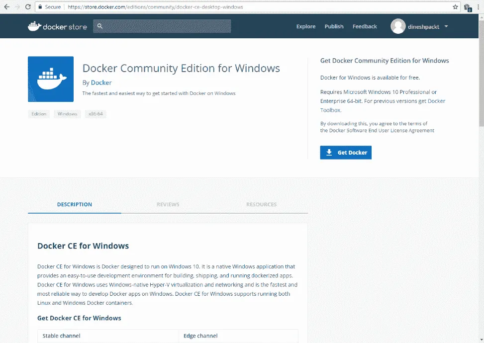 让我们从这里安装 Docker。 完成此操作的最快方法是前往菜单。 在这里,我们将选择下载 Windows 版本。 单击一下,直接转到 Docker 商店,您可以在其中下载适用于您平台的特定安装程序,如以下屏幕快照所示: