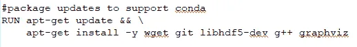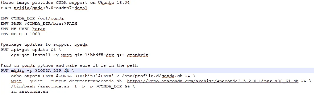 这就是我们将用来创建环境的东西。 我们从具有 CUDA 和 cuDNN 驱动程序的基本 NVIDIA 镜像开始,它将在将来支持 GPU。 现在,在下一部分中,我们将更新容器上的包管理器,以确保我们具有git和wget更新的图形包,以便能够在笔记本中绘制图表: