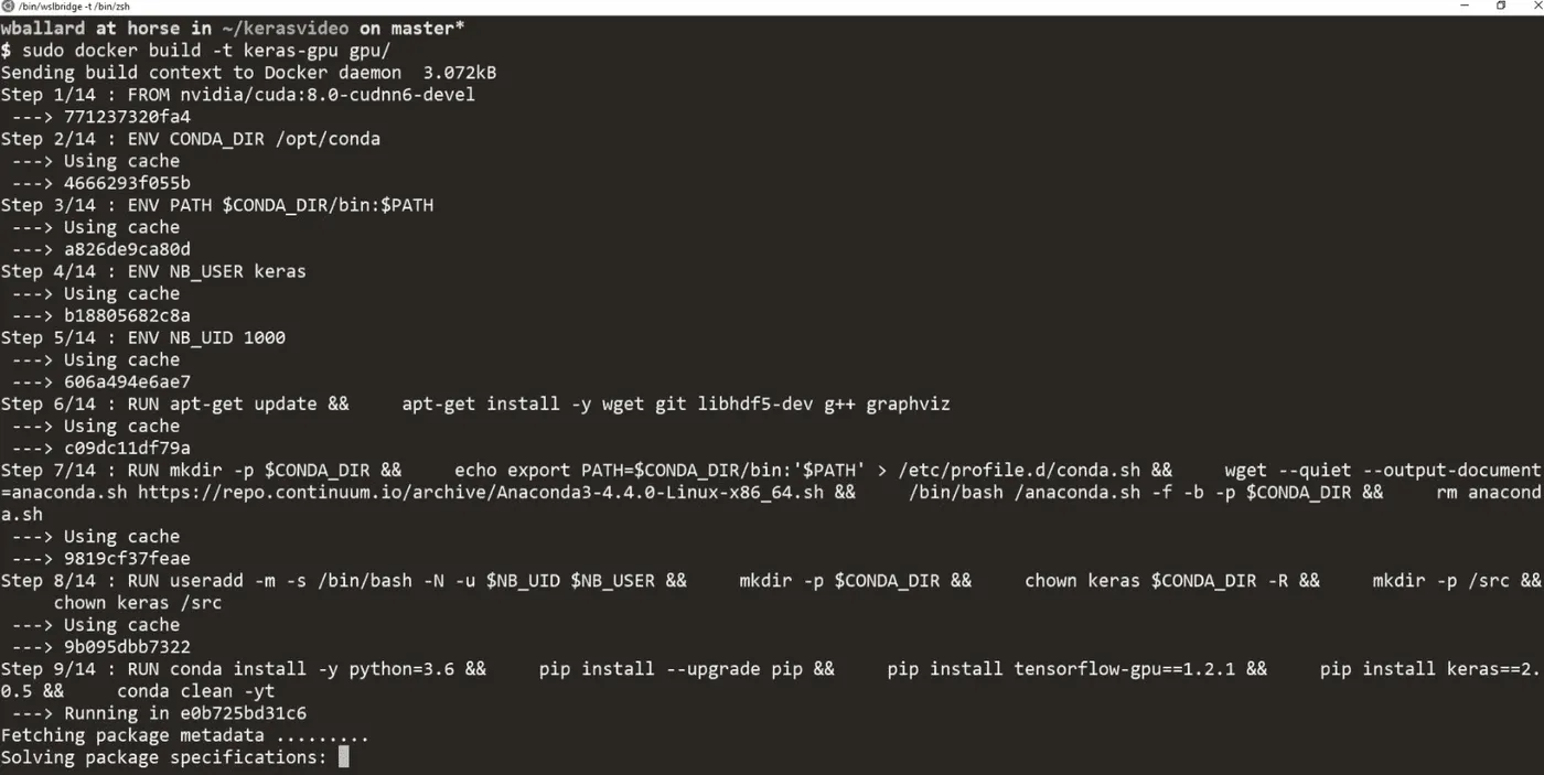 方便地,在 Linux 上构建的命令与在 Windows 上使用 Docker 的命令完全相同。 但是,如果要在 Linux 主机上使用 GPU 支持,则可以选择使用nvidia-docker进行构建。 那么docker build的作用是什么? 好吧,它将获取并执行 Docker 文件,下载包,创建文件系统,运行命令,然后将所有这些更改保存到虚拟文件系统中,以便以后可以重用。 每次运行 Docker 容器时,它都从运行构建时的状态开始。 这样,每次运行都是一致的。