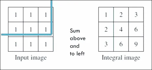 积分图像是与输入图像尺寸相同的图像,但是每个积分像素(i, j)是在输入像素(i, j)上方和左侧的所有输入像素的总和。 例如,当左上像素用(0, 0)索引时,值6的整数像素(1, 2)是所有输入像素(i, j)的总和,其中i <= 1,j <= 2。