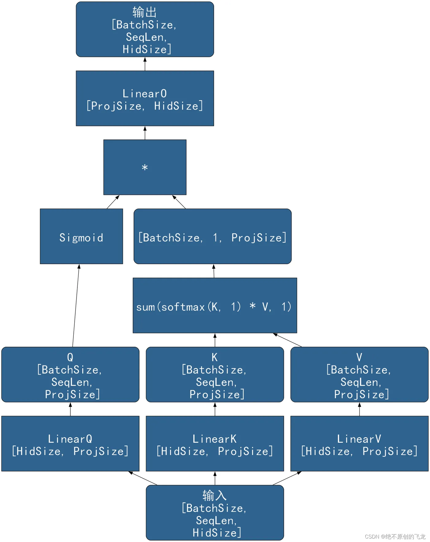 digraph AFTSimple { rankdir=BT node [ style=filled, color=Black fontcolor=White, fillcolor="#30638e", fontname="SimHei", fontsize=32, width=5, height=2, ] inp [label="输入\n[BatchSize,\n SeqLen,\n HidSize]", shape="Mrecord"] llq [label="LinearQ\n[HidSize, ProjSize]", shape="box"] llk [label="LinearK\n[HidSize, ProjSize]", shape="box"] llv [label="LinearV\n[HidSize, ProjSize]", shape="box"] q [label="Q\n[BatchSize,\n SeqLen,\n ProjSize]", shape="Mrecord"] k [label="K\n[BatchSize,\n SeqLen,\n ProjSize]", shape="Mrecord"] v [label="V\n[BatchSize,\n SeqLen,\n ProjSize]", shape="Mrecord"] σ [label="Sigmoid", shape="box", width=3] atten_op [label="sum(softmax(K, 1) * V, 1)", shape="box"] atten [label="[BatchSize, 1, ProjSize]", shape="Mrecord"] mul [label="*", shape="box", width=3] llo [label="LinearO\n[ProjSize, HidSize]", shape="box"] oup [label="输出\n[BatchSize,\n SeqLen,\n HidSize]", shape="Mrecord"] inp -> llq inp -> llk inp -> llv llq -> q llk -> k llv -> v q -> σ k -> atten_op v -> atten_op atten_op -> atten σ -> mul atten -> mul mul -> llo llo -> oup }