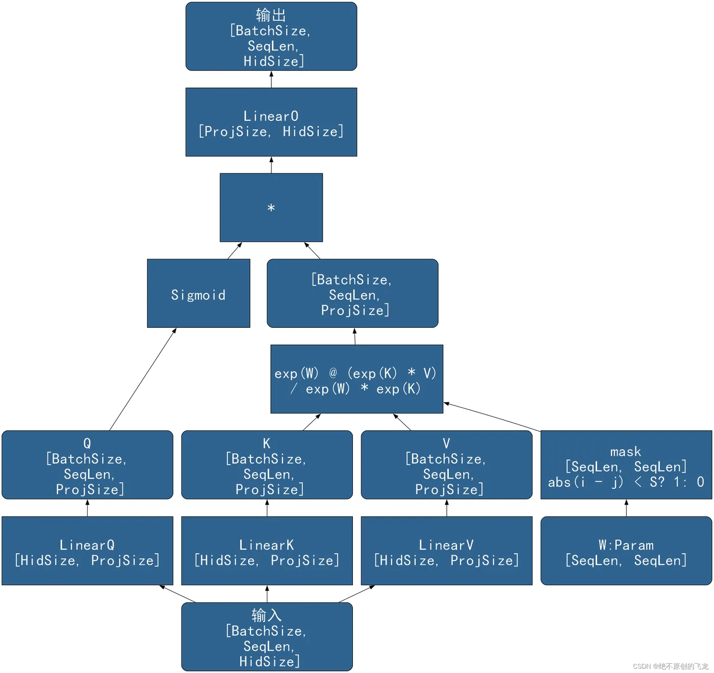 digraph AFTLocal { rankdir=BT node [ style=filled, color=Black fontcolor=White, fillcolor="#30638e", fontname="SimHei", fontsize=32, width=5, height=2, ] inp [label="输入\n[BatchSize,\n SeqLen,\n HidSize]", shape="Mrecord"] llq [label="LinearQ\n[HidSize, ProjSize]", shape="box"] llk [label="LinearK\n[HidSize, ProjSize]", shape="box"] llv [label="LinearV\n[HidSize, ProjSize]", shape="box"] w [label="W:Param\n[SeqLen, SeqLen]", shape="Mrecord"] mask [label="mask\n[SeqLen, SeqLen]\nabs(i - j) < S? 1: 0", shape="box"] q [label="Q\n[BatchSize,\n SeqLen,\n ProjSize]", shape="Mrecord"] k [label="K\n[BatchSize,\n SeqLen,\n ProjSize]", shape="Mrecord"] v [label="V\n[BatchSize,\n SeqLen,\n ProjSize]", shape="Mrecord"] σ [label="Sigmoid", shape="box", width=3] atten_op [label="exp(W) @ (exp(K) * V)\n/ exp(W) * exp(K)", shape="box"] atten [label="[BatchSize,\n SeqLen,\n ProjSize]", shape="Mrecord"] mul [label="*", shape="box", width=3] llo [label="LinearO\n[ProjSize, HidSize]", shape="box"] oup [label="输出\n[BatchSize,\n SeqLen,\n HidSize]", shape="Mrecord"] inp -> llq inp -> llk inp -> llv llq -> q llk -> k llv -> v q -> σ w -> mask mask -> atten_op k -> atten_op v -> atten_op atten_op -> atten σ -> mul atten -> mul mul -> llo llo -> oup