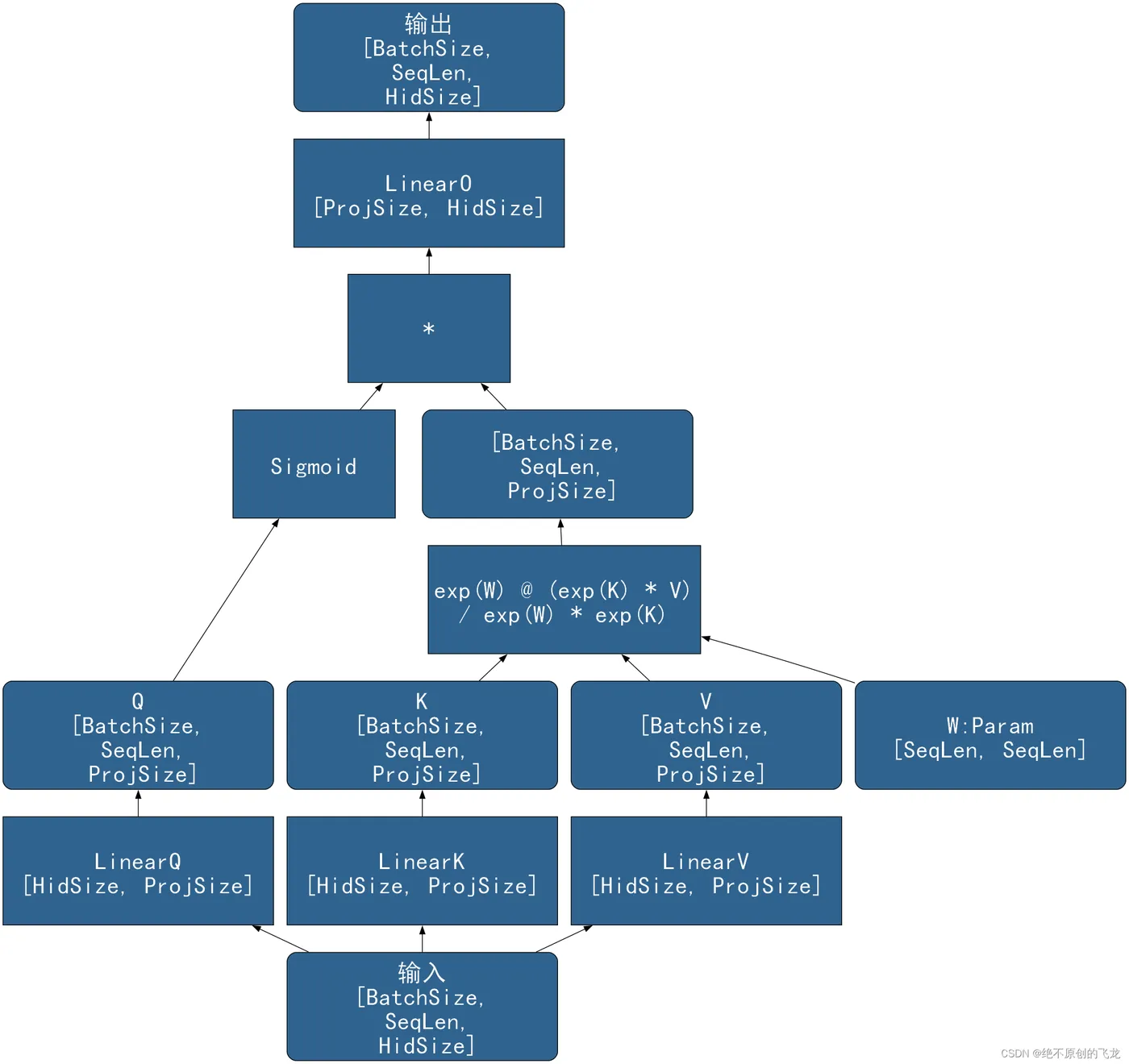 digraph AFTFull { rankdir=BT node [ style=filled, color=Black fontcolor=White, fillcolor="#30638e", fontname="SimHei", fontsize=32, width=5, height=2, ] inp [label="输入\n[BatchSize,\n SeqLen,\n HidSize]", shape="Mrecord"] llq [label="LinearQ\n[HidSize, ProjSize]", shape="box"] llk [label="LinearK\n[HidSize, ProjSize]", shape="box"] llv [label="LinearV\n[HidSize, ProjSize]", shape="box"] w [label="W:Param\n[SeqLen, SeqLen]", shape="Mrecord"] q [label="Q\n[BatchSize,\n SeqLen,\n ProjSize]", shape="Mrecord"] k [label="K\n[BatchSize,\n SeqLen,\n ProjSize]", shape="Mrecord"] v [label="V\n[BatchSize,\n SeqLen,\n ProjSize]", shape="Mrecord"] σ [label="Sigmoid", shape="box", width=3] atten_op [label="exp(W) @ (exp(K) * V)\n/ exp(W) * exp(K)", shape="box"] atten [label="[BatchSize,\n SeqLen,\n ProjSize]", shape="Mrecord"] mul [label="*", shape="box", width=3] llo [label="LinearO\n[ProjSize, HidSize]", shape="box"] oup [label="输出\n[BatchSize,\n SeqLen,\n HidSize]", shape="Mrecord"] inp -> llq inp -> llk inp -> llv llq -> q llk -> k llv -> v q -> σ w -> atten_op k -> atten_op v -> atten_op atten_op -> atten σ -> mul atten -> mul mul -> llo llo -> oup }