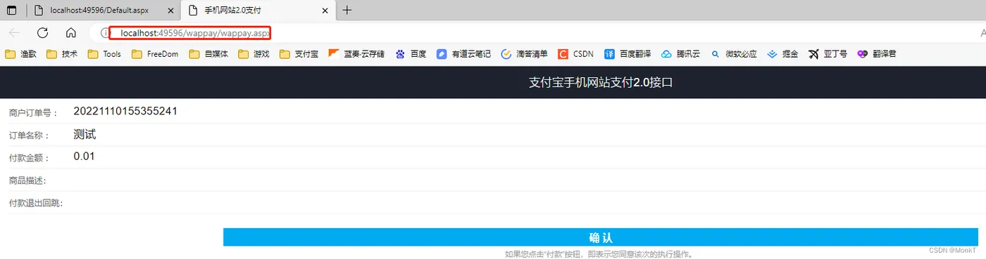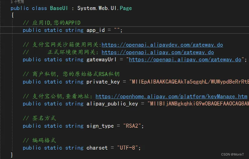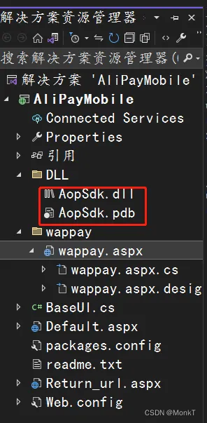 我们下载NET的。alipay.trade.page.pay-DoNet-UTF-8.zip这个文件解压后使用vs2022不能运行,我就自己新建了个项目运行结果看一下。