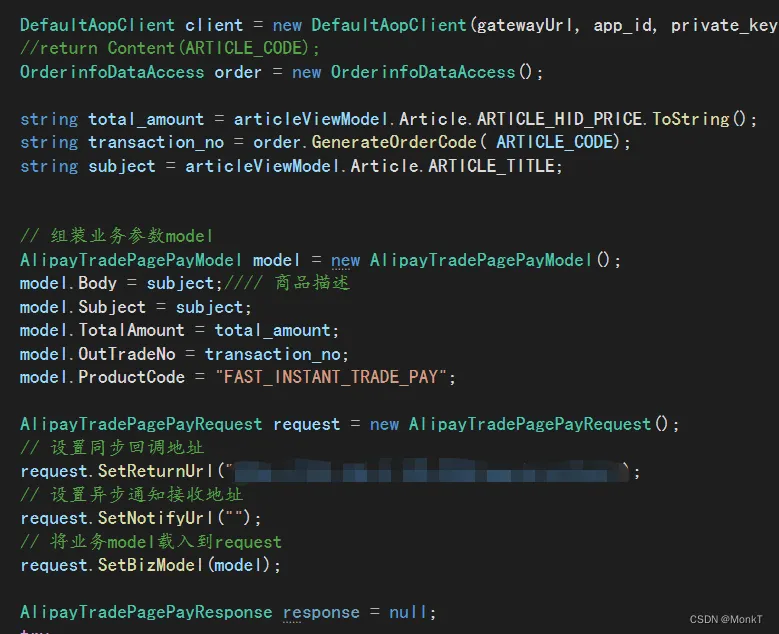 DefaultAopClient client = new DefaultAopClient(gatewayUrl, app_id, private_key, "json", "1.0", sign_type, alipay_public_key, charset, false); //return Content(ARTICLE_CODE); OrderinfoDataAccess order = new OrderinfoDataAccess(); string total_amount = articleViewModel.Article.ARTICLE_HID_PRICE.ToString(); string transaction_no = order.GenerateOrderCode( ARTICLE_CODE); string subject = articleViewModel.Article.ARTICLE_TITLE; // 组装业务参数model AlipayTradePagePayModel model = new AlipayTradePagePayModel(); model.Body = subject; 商品描述 model.Subject = subject; model.TotalAmount = total_amount; model.OutTradeNo = transaction_no; model.ProductCode = "FAST_INSTANT_TRADE_PAY"; AlipayTradePagePayRequest request = new AlipayTradePagePayRequest(); // 设置同步回调地址 request.SetReturnUrl("http://192.168.3.170:9103/pay/alireturn"); // 设置异步通知接收地址 request.SetNotifyUrl(""); // 将业务model载入到request request.SetBizModel(model); AlipayTradePagePayResponse response = null; try { response = client.pageExecute(request, null, "post"); //Response.Write(response.Body); //return Content(response.Body); ViewData["PaymentBody"] = response.Body; return View(); } catch (Exception exp) { throw exp; }