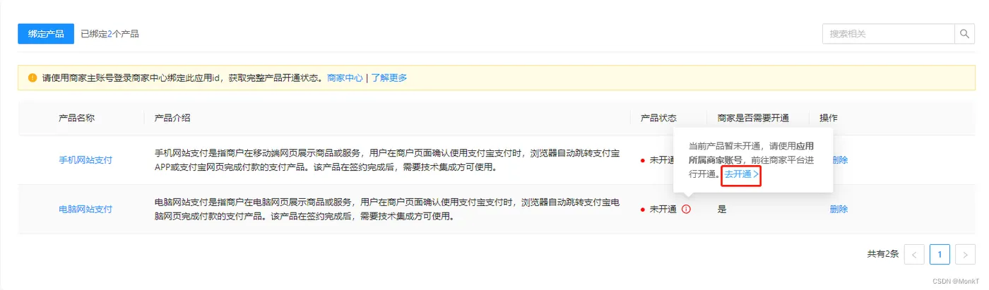 选电脑网站支付然后点击确定,这时候在产品绑定页面显示未开通。