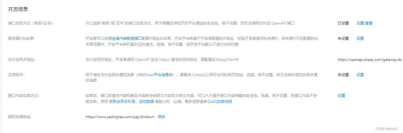将生成的公钥配置到开发设置【接口加签方式(密钥/证书):】中即可。其他配置根据自己服务器和软件要求进行相应的配置就可以。
