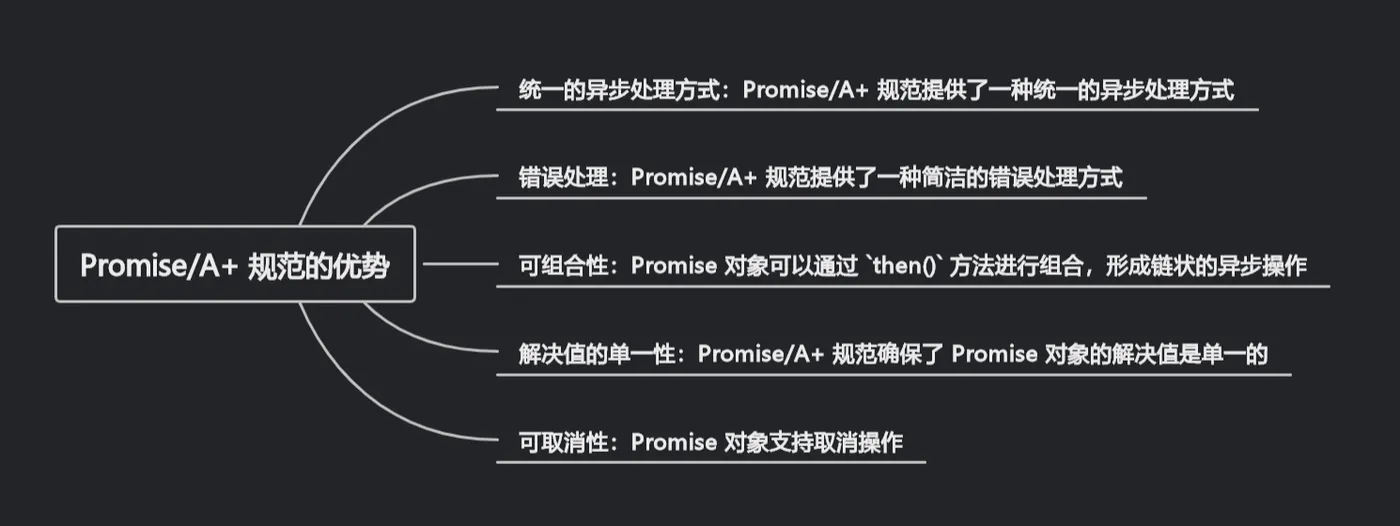 总之,Promise/A+ 规范提供了一种简洁、标准化的异步处理方式,使得异步代码更加易于理解、编写和维护。它的错误处理、可组合性、解决值的单一性和可取消性等优势使得它成为异步编程的一种重要方式。