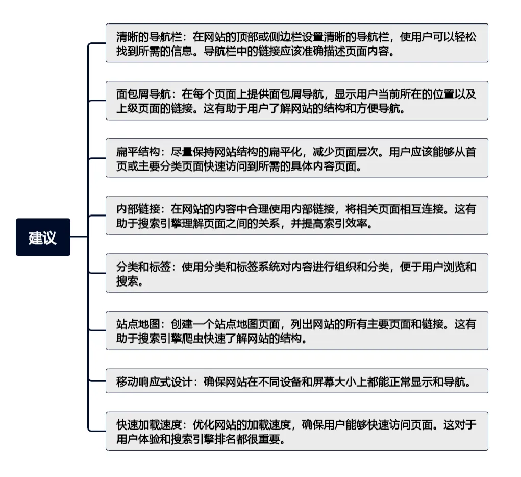 - 扁平结构:尽量保持网站结构的扁平化,减少页面层次。用户应该能够从首页或主要分类页面快速访问到所需的具体内容页面。