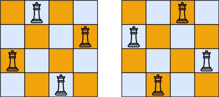 解释:如上图所示,4 皇后问题存在两个不同的解法。