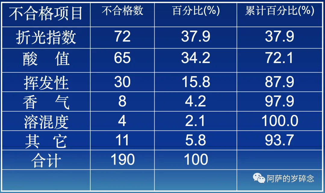 4. 根据以上原则。我们发现A类主要因素是折光指数和酸值。也就是说不合格项目主要是这2个因素。 这也是我们的主要矛盾。