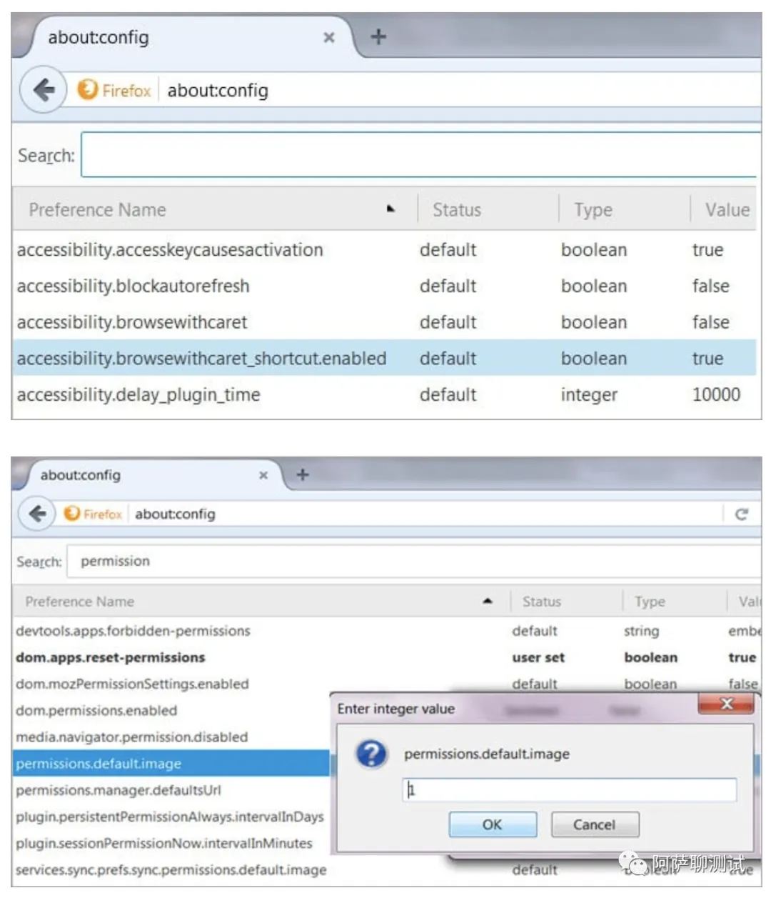 Firefox-配置设置在得到这个屏幕后,你必须搜索' permission.default.image '并将值从0-1调整。