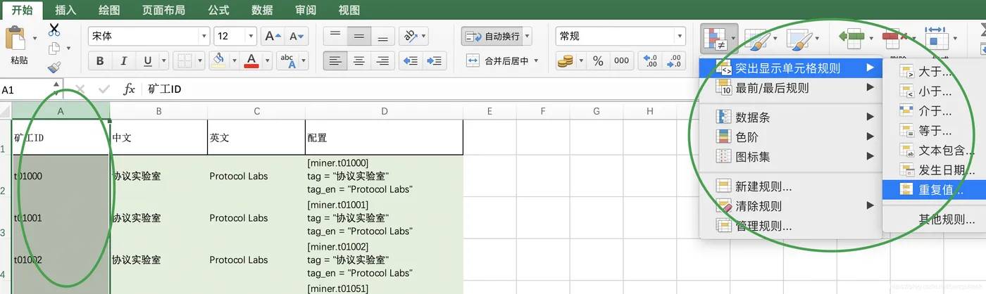 点击菜单栏:开始——条件格式——突出显示单元格规则——重复值;